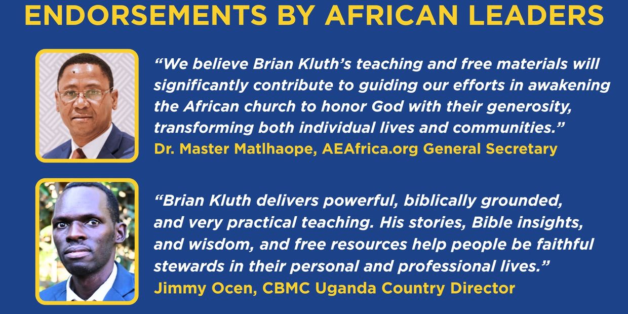 Brian Kluth's ministry has been a speaker for AEAfrica.org, Evangelical Fellowship of Uganda, National Fellowship of Born-Again Pentecostal Churches, Church of Uganda National Headquarters, Church of Uganda Diocese Offices, Compassion International in Uganda, and Uganda Christian University (Mukono, Kampala, Kabale Campuses), CBMC Marketplace Business Ministry, Pastor Networks, Colleges, Schools, and Churches.